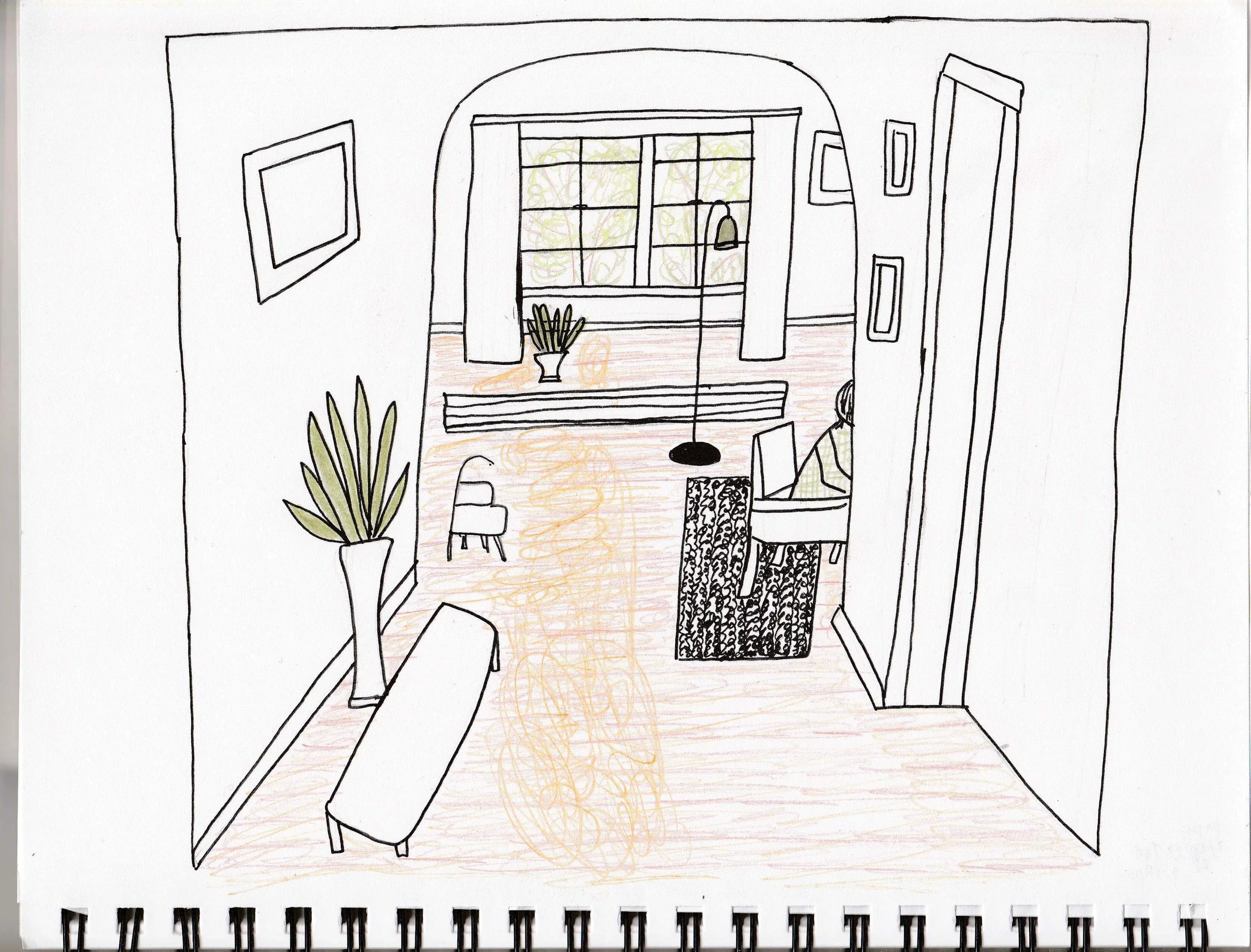 On the other hand, I got the happiest kick while drawing the arched doorway between the rooms that reminded me of more than one friend’s home, and drawing the little locks on the big bay window, and then having a light-bulb moment about adding in a pop of life-giving green on the plants, and attempting some splash of light across the floors, and making the one rug a sisal rug with squiggle motions, and then drawing lines for wooden floors, my favorite flooring—all, nothing but joy and in the flow.